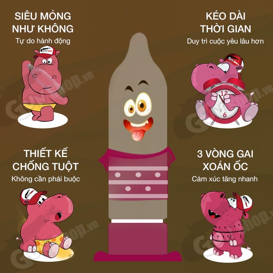 Bao cao su Gold với thiết kế độc đáo nổi bật nhiều gai và gân giúp tăng cường khoái cảm khi quan hệ. Những điểm nhạy cảm trên bề mặt bao cao su chạm đúng vị trí, kích thích mạnh mẽ khiến nàng luôn hưng phấn, xua tan sự nhàm chán trong chuyện phòng the. Sản phẩm là lựa chọn tuyệt vời để bạn và người ấy trải nghiệm cảm giác mới mẻ và đầy thú vị mỗi lần gần gũi.