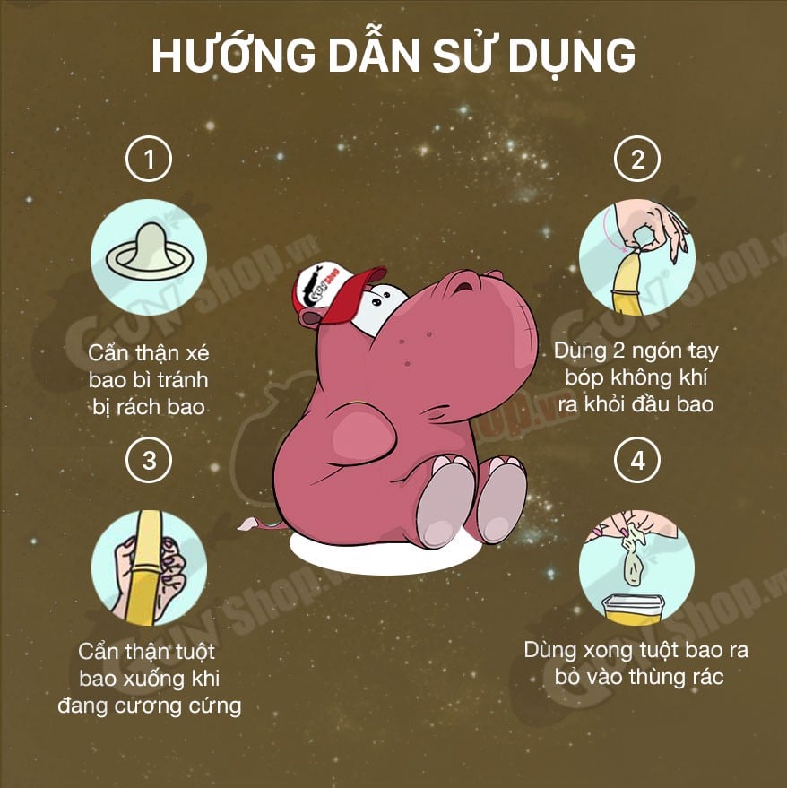 Để bao cao su phát huy tối đa tác dụng, bạn nên xé nhẹ một góc bao rồi bóp nhẹ cho không khí trong đầu bao thoát ra khỏi. Tiếp đó, nhẹ nhàng đặt bao vào đầu dương vật đang cương cứng rồi vuốt xuống đến tận gốc. Sau khi quan hệ xong, giữ chắc đầu bao để tránh tinh dịch tràn ra ngoài, thắt miệng bao và vứt đúng nơi quy định.