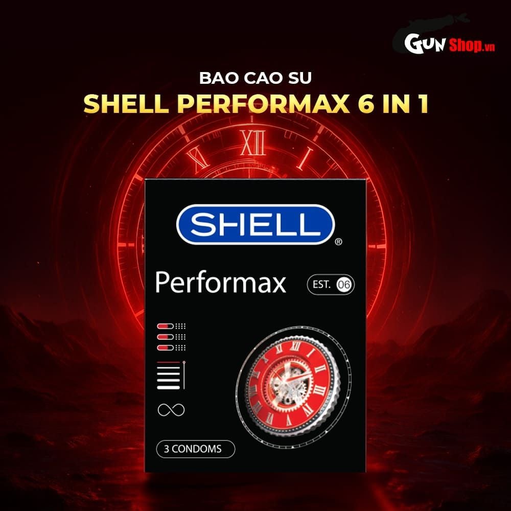 Bao cao su Shell Performax 6 in 1 là giải pháp hoàn hảo từ Hàn Quốc dành cho những trải nghiệm tình dục đỉnh cao. Sản phẩm kết hợp 6 tính năng ưu việt giúp kéo dài thời gian, tăng sự hưng phấn và làm mới cảm xúc mỗi lần ân ái. Với thiết kế siêu mỏng chỉ 0.06mm, Shell Performax mang đến cảm giác tự nhiên như không dùng bao, truyền nhiệt nhanh và chân thật.