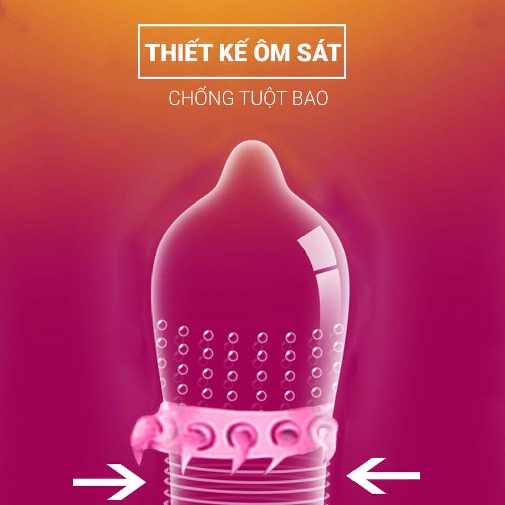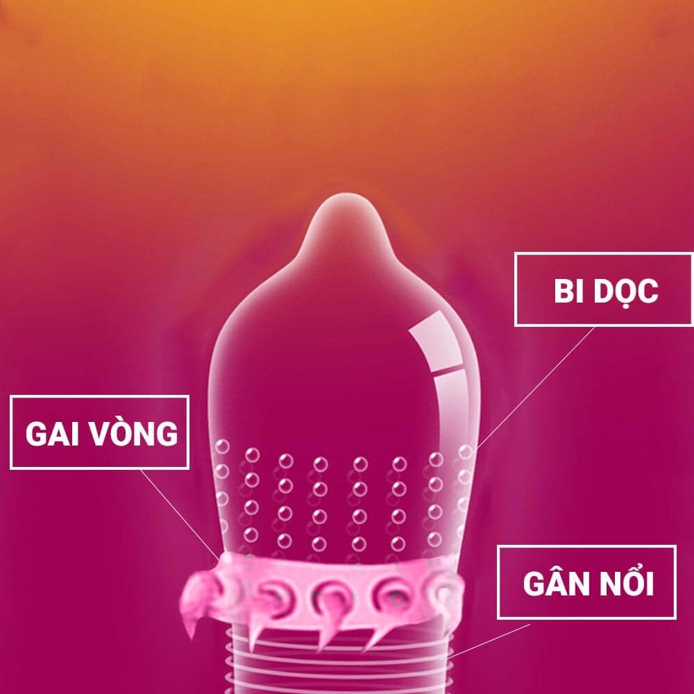Bao cao su Super Gold sở hữu các chi tiết gân nổi, gai lớn và bi vòng dọc giúp gia tăng ma sát, tác động trực tiếp vào những điểm nhạy cảm nhất của bạn tình. Điều này mang lại sự thăng hoa tuyệt đối cho cả hai, khiến mỗi lần ân ái trở nên thật sự khác biệt và khó quên.