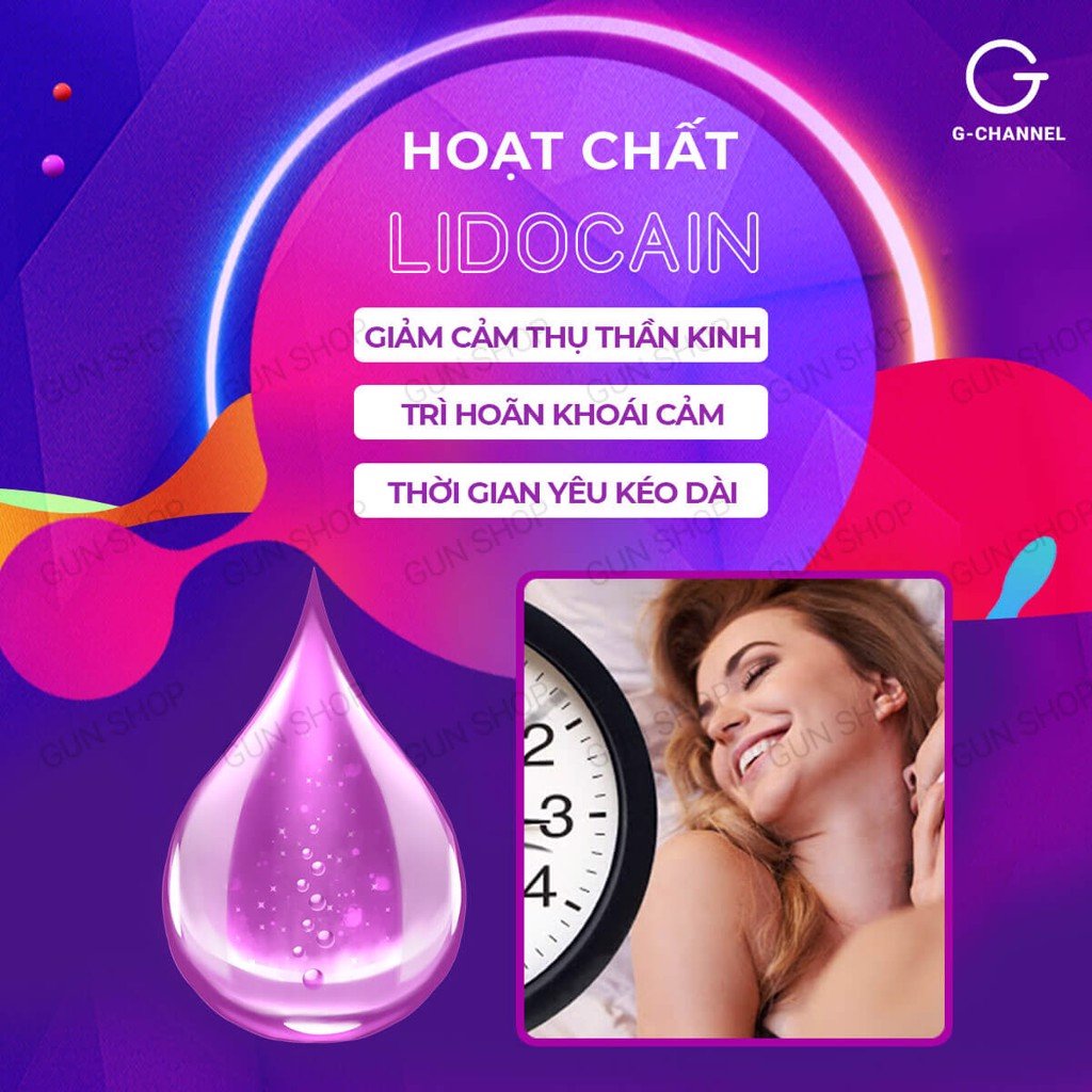 Thành phần: Lidocain 9.6% – tác động trực tiếp làm tê niêm mạc, kiểm soát tín hiệu kích thích và ngăn ngừa xuất tinh sớm.