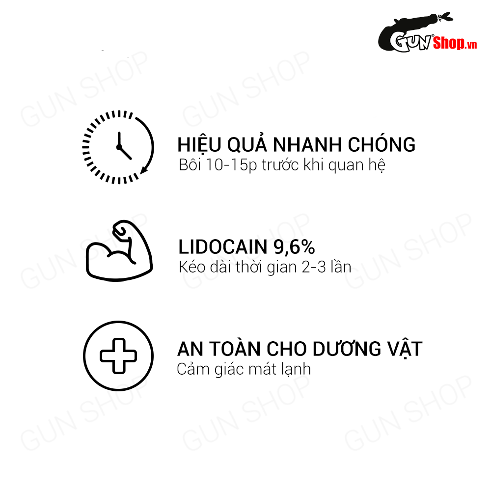 Gel chứa Lidocaine 9.6% – hoạt chất được chọn lọc kỹ để giảm kích thích thần kinh, từ đó giúp nam giới kiểm soát thời gian xuất tinh hiệu quả mà không làm mất cảm giác tự nhiên. Sản phẩm mang đến trải nghiệm mát lạnh dễ chịu khi sử dụng, không gây nóng rát hay khó chịu cho da vùng nhạy cảm.