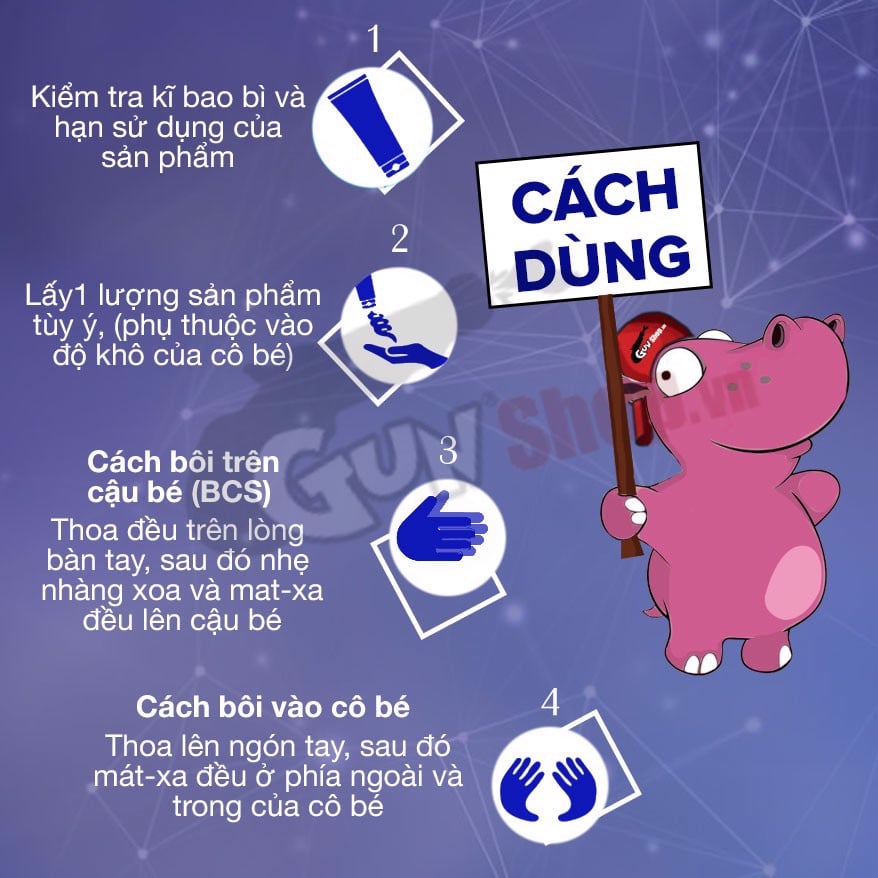 Lấy một lượng gel vừa đủ, thoa nhẹ nhàng lên vùng “cậu bé”, “cô bé” hoặc vùng hậu môn.