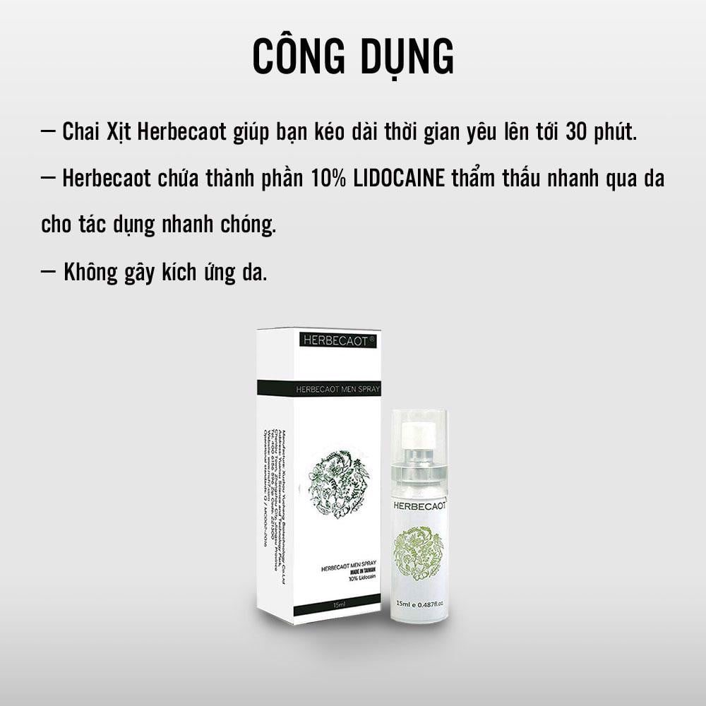 Bạn mong muốn có những phút giây thăng hoa không giới hạn và tăng thêm sự tự tin trong chuyện gối chăn? Chai xịt Herbecaot là giải pháp lý tưởng dành cho các quý ông muốn kéo dài thời gian quan hệ lên đến 2 - 3 lần so với bình thường. Sản phẩm nhập khẩu chính hãng từ Đài Loan, ứng dụng công nghệ hiện đại cùng thành phần 100% thảo dược thiên nhiên an toàn tuyệt đối cho sức khỏe.