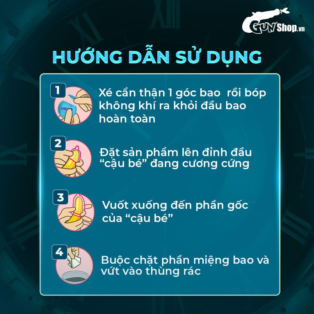Bạn chỉ cần xé nhẹ góc gói, bóp nhẹ đầu bao để đẩy không khí ra ngoài. Sau đó đặt bao lên dương vật khi đã cương cứng, vuốt nhẹ để bao phủ đều đến tận gốc. Cuối cùng, giữ đầu bao và rút nhẹ nhàng, thắt miệng bao rồi vứt bỏ đúng nơi quy định. Thực hiện đúng cách sẽ tăng hiệu quả bảo vệ, tránh vi khuẩn và rủi ro ngoài ý muốn.